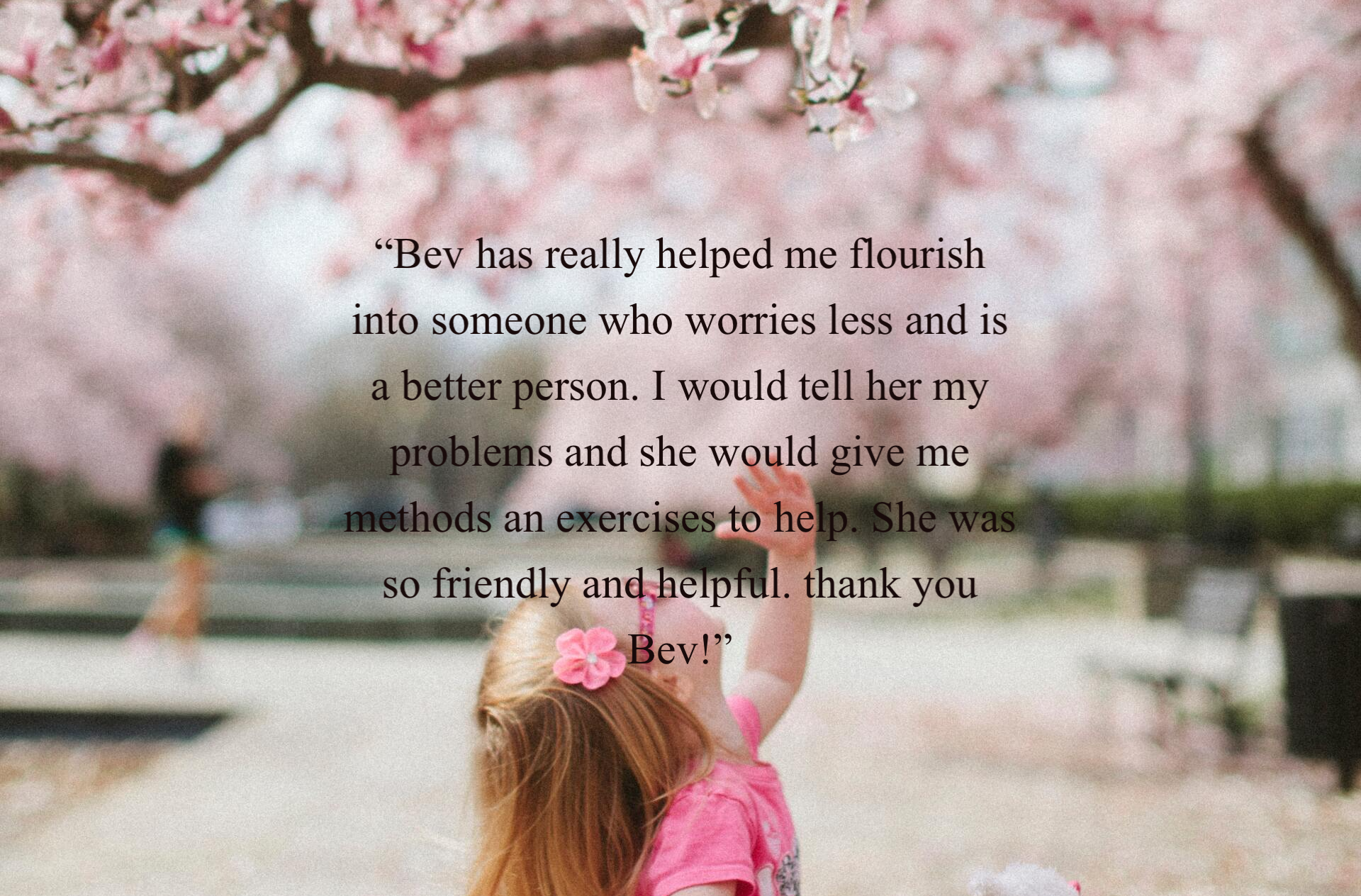 "Bev has really helped me flourish into someone who worries less and is a better person. I would tell her my problems and she would give me methods and exercises to help. Now, whenever I have a problem, I wish I was still doing sessions with Bev as she was so friendly and helpful. Thank you Bev!” Anonymous 2020